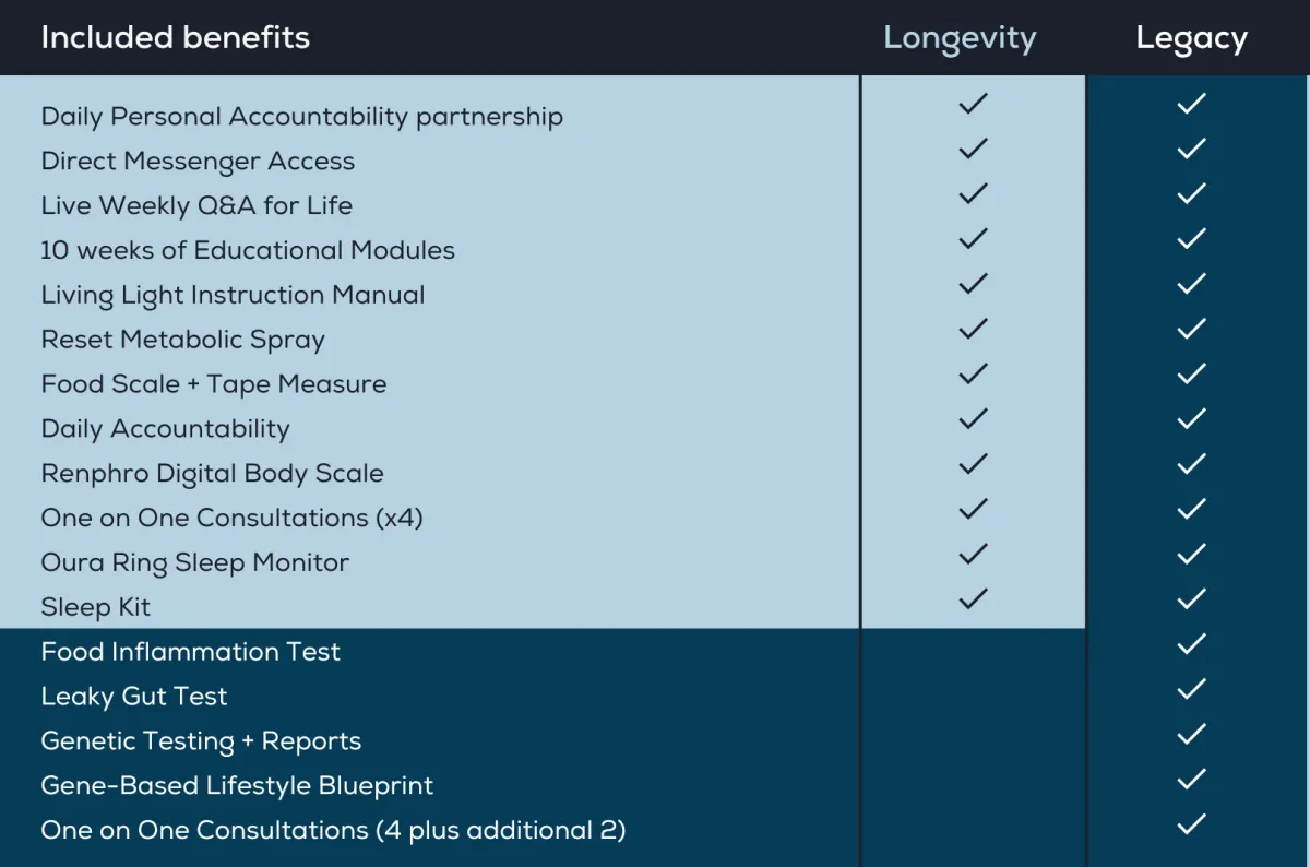 Our legacy program will include 2 one hour longevity consults to go over your genomic recommendations and age rate recommendations in detail to customize a lifestyle and nutrition plan that is optimized for you.